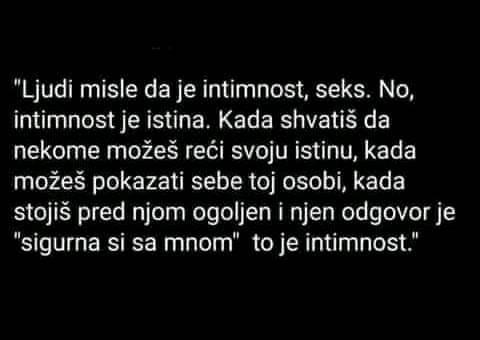 Intimnost je istina,kada shvatiš da nekome možeš reći svoju istinu,kada možeš pokazati pravog sebe toj nekoj osobi!